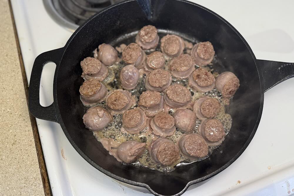 • Add the sausages and let them cook for about 10-12 minutes. You can finish them off with a quick sear in a pan or on the grill for added flavor and color.
